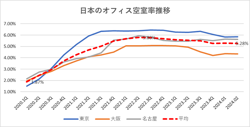 感染拡大とともに空室率は上昇し、ピークは2022年第二四半期の平均5.80%(月次では4月が5.87%がピーク)になっています。その後ゆるやかに改善、2024年2月が5.28%となり、緊急事態宣言が実施されていた2021年後半以降、5%台を維持しながらも悪化することなく現在に至っています。