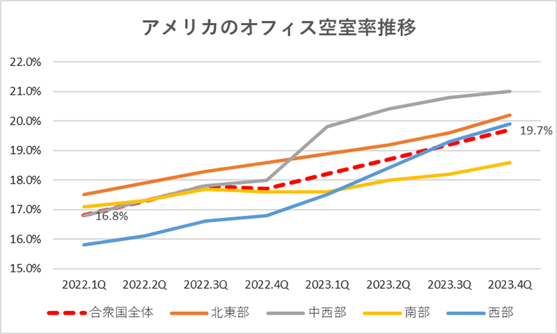 データは2022年からのものになりますが、アメリカがコロナ収束を宣言したのは2022年9月です。コロナ収束にもかかわらずオフィス空室率はさらに上昇し、2023年第1四半期には18%を突破しています。