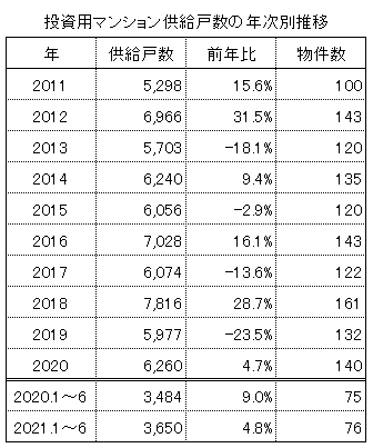 首都圏の投資用マンション市場は、超低金利などを背景に90年代後半から00年代半ばにかけて供給戸数を伸ばし、07年には9210戸と初めて9000戸を突破。しかし、地価高騰やリーマンショック等により08年に7006戸と急減すると、10年には4583戸にまで落ち込んだ。11年以降は5000戸台から7000戸台で推移しており、20年は前年比4・7%増の6260戸となった。