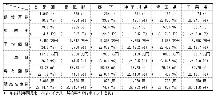新規供給に対する契約戸数は1417戸で、初月契約率は73・0%。前年同月の68・5%に比べ4・5㌽アップし、2カ月ぶりに70%を上回った。エリア別では埼玉県と千葉県が50%台と低迷した一方で、都区部、都下、神奈川県は70%台に乗せている。