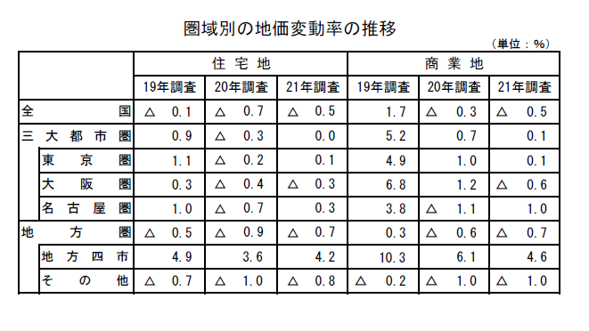 国土交通省は21日、都道府県地価調査(21年7月1日時点、基準地数2万1443地点)を公表した。全用途平均は前年比△0・4%(20年△0・6%)となり、2年連続で下落した。新型コロナウイルスの感染拡大がもたらした地価の下落傾向は、依然として商業地に色濃く出た。一方で、三大都市圏で名古屋のみV字回復をみせるなど、新たな動きもみられた。