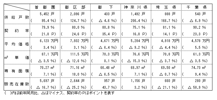 供給戸数をエリア別にみると、大阪市部が128・1%増の821戸、大阪府下が24・7%減の466戸、神戸市部が68・4%増の96戸、兵庫県下が118・4%増の415戸、京都市部が6・4%減の220戸、京都府下が前年同月と同値の26戸、滋賀県が25・4%減の53戸、和歌山県が前年同月と同値の2戸、奈良県での発売はなかった。