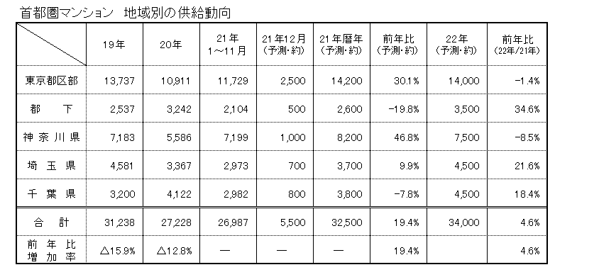 不動産経済研究所は21日、「2022年の首都圏マンション市場予測」を発表した。昨年後半からのエンドユーザーの積極的な購入姿勢は変わらず、3万2500戸前後(20年比19・4%増)となる21年と比べて4・6%増の3万4000戸を見込んでおり、2年連続の増加となる見通し。