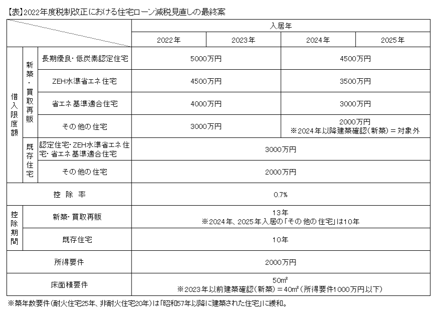 所得要件は、現行の3000万円から2000万円に引き下げる。床面積要件は、23年以前に建築確認を受けた新築住宅については、合計所得1000万円以下の取得者に限って40㎡に緩和する。