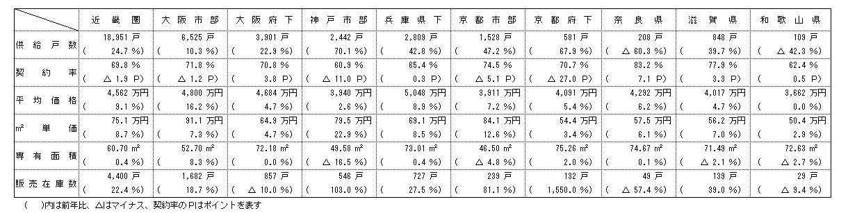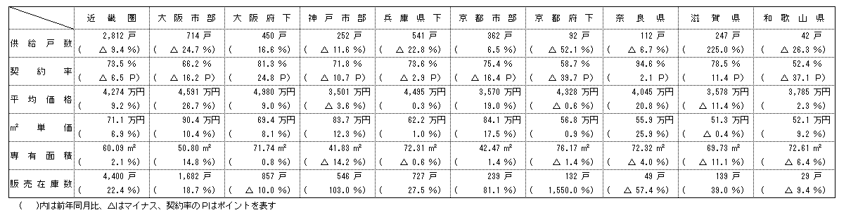エリア別の発売戸数をみると、大阪市部が前年比10・3%増の6525戸、大阪府下が22・9%増の3901戸、神戸市部が70・1%増の2442戸、兵庫県下が42・8%増の2809戸、京都市部が47・2%増の1528戸、京都府下が67・9%増の581戸、奈良県が60・3%減の208戸、滋賀県が39・7%増の848戸、和歌山県が42・3%減の109戸。