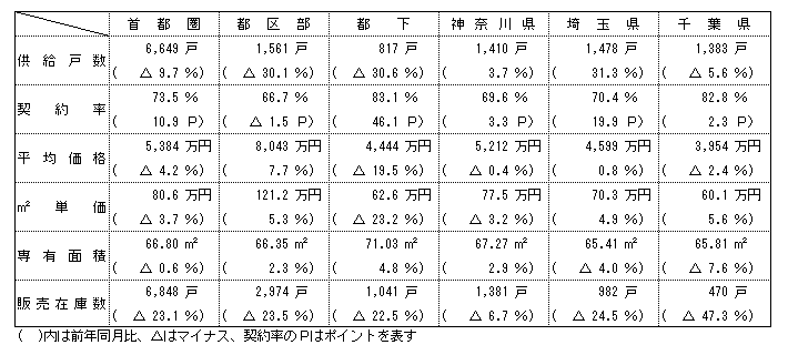 エリア別の供給戸数、契約率、平均価格、㎡単価は以下の通り。▽東京都区部=1561戸、66・7%、8043万円、121・2万円▽都下=817戸、83・1%、4444万円、62・6万円▽神奈川県=1410戸、69・6%、5212万円、77・5万円▽埼玉県=1478戸、70・4%、4599万円、70・3万円▽千葉県=1383戸、82・8%、3954万円、60・1万円。供給戸数は神奈川県と埼玉県が増加するも、千葉県は微減、都区部と都下は3割減と落ち込んだ。価格は都区部と埼玉県が上昇、都下、神奈川県、千葉県は下落している。
