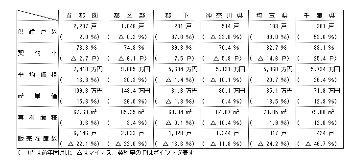 中古戸建ての成約価格は前月比7・8%上昇の3769万円。前年同月比では11・1%上昇し、16カ月連続で前年を上回った。新規登録件数は3765件。在庫件数は前年同月比19・4%減の1万3461件で、2ケタ減は17カ月連続となる。前月比では0・4%増。成約件数をエリア別にみると、千葉県を除く地域で前年を下回り、都区部が13・0%減の207件、多摩が22・7%減の174件、埼玉県が10・3%減の252件、千葉県が0・4%増の256件など。