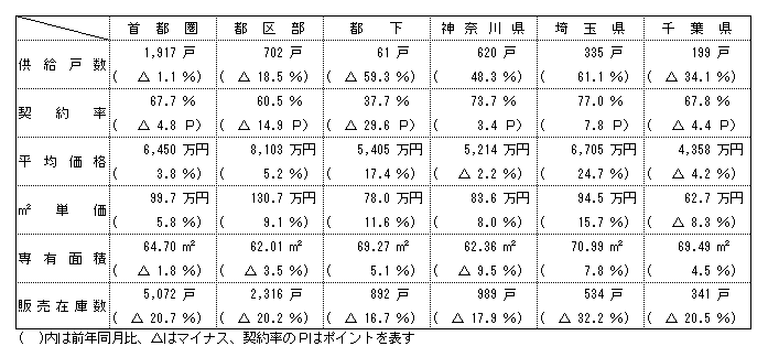 新規供給に対する契約戸数は1298戸で、初月契約率は67・7%。前年同月(72・5%)との比較では4・8㌽ダウンとなり、5カ月ぶりに70%台を下回った。