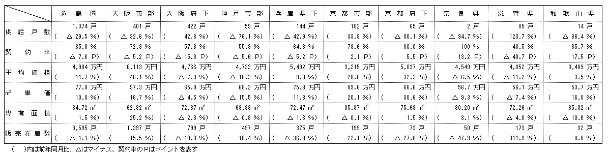 供給戸数をエリア別にみると、大阪市部が32・6%減の401戸、大阪府下が42・6%増の422戸、神戸市部が76・1%減の59戸、兵庫県下が42・9%減の144戸、京都市部が33・8%増の182戸、京都府下が80・1%減の65戸、奈良県が94・7%減の2戸、滋賀県が123・7%増の85戸、和歌山県が36・4%減の14戸。