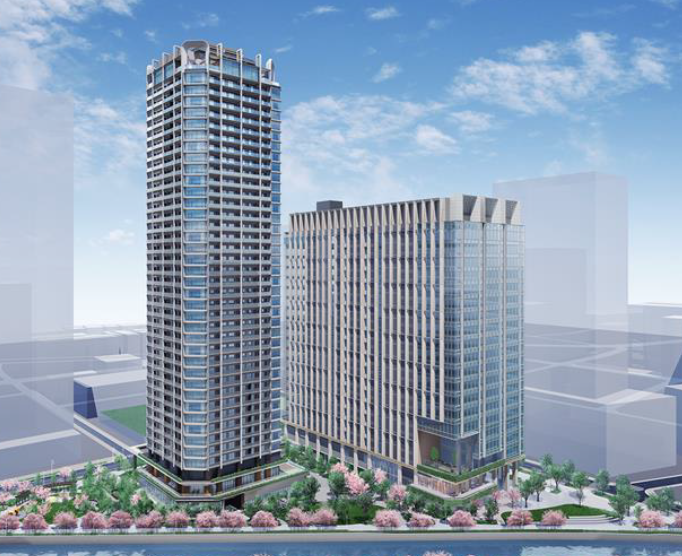 街区の名称は「大崎リバーウォークガーデン」。計画地の中央にタワマン、その東側にオフィス棟を配置する。オフィスビルは大崎駅、タワマンは五反田駅に近い位置だ。延床面積はオフィス棟が約6・9万㎡、住宅棟が約4・32万㎡。施工は竹中工務店。計画地の南側は目黒川に面する。