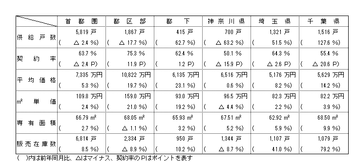 エリア別の供給戸数、契約率、平均価格、㎡単価は以下の通り。▽都区部=1867戸、75・3%、1億822万円、159・0万円▽都下=415戸、62・4%、6135万円、93・0万円▽神奈川県=700戸、50・1%、6516万円、96・5万円▽埼玉県=1321戸、64・3%、5176万円、82・3万円▽千葉県=1516戸、55・4%、5629万円、82・2万円。供給戸数は都下、埼玉県、千葉県が大幅に増加した一方、都区部と神奈川県は2ケタ減と落ち込んだ。平均価格は全てのエリアが軒並み上昇している。