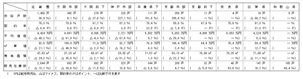 供給戸数をエリア別にみると、大阪市部が8・1%増の442戸、大阪府下が27・6%減の278戸、神戸市部が227・1%増の229戸、兵庫県下が101・8%増の111戸、京都市部が298・9%増の359戸、京都府下が11戸、奈良県が4戸、滋賀県が66・7%減の16戸。