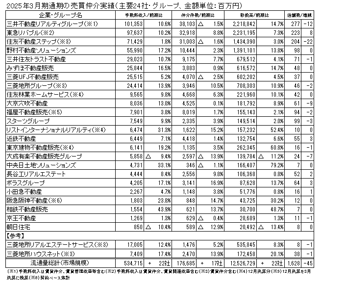 不動産流通主要24社・グループにおける25年3月期(24年4月~25年3月)の売買仲介実績が出揃った。開示姿勢の変化やグループでの開示などを反映した調査を実施した。手数料収入は、個社で初の1000億円に到達した三井不動産リアルティが調査開始以来の1位を維持した。加えて、仲介件数でも1位を堅持。取扱高は、東急リバブルが2年連続で1位を獲得した。仲介件数でも三井不動産リアルティに続く3万2000件台の2位で、更なる成長も見据える。23年度と比べた3指標の動向は、手数料収入の増加が22社、仲介件数の増加が17社、取扱高の増加が22社と、総じて売買仲介の堅調な業況が明らかとなった。