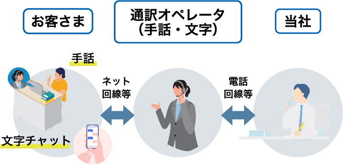 通訳オペレータが「手話」または「文字」と「音声」を通訳することにより、電話で即時双方向につなぐサービスです。