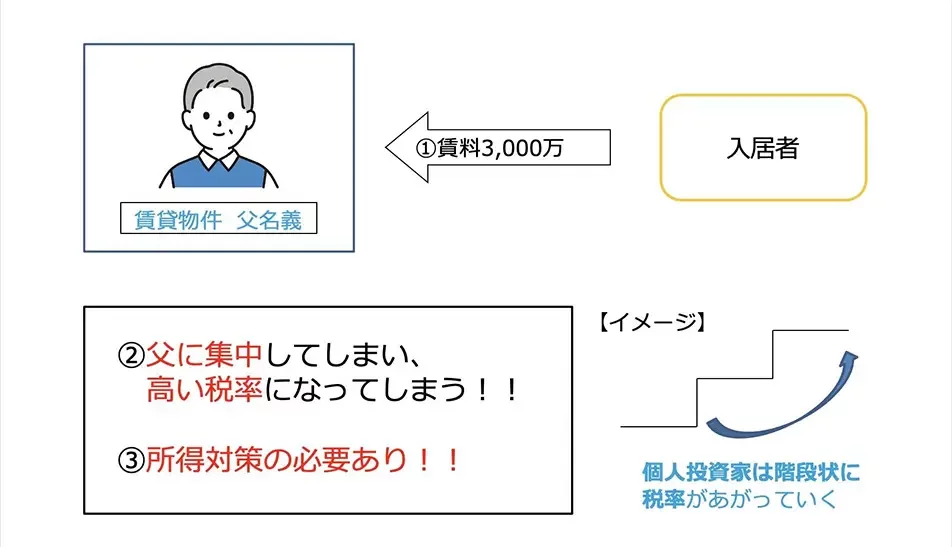 例えば、資産管理会社がなく、入居者からの家賃収入が個人名義に入る場合、個人(父)に所得が集中することでの所得税の税率が高くなってしまうため、所得対策が必要となります。(下記の図を参照。)