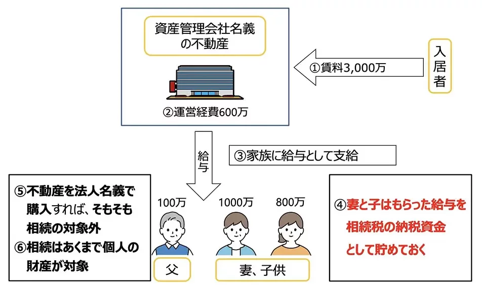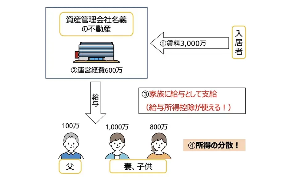 一方、資産管理会社がある場合は入居者からの家賃収入が会社に入ります。運営経費となる維持管理費(一般的には2割前後)を差し引いた金額は、給与として家族(妻、子供)に支払うことができます。このとき、給与所得控除を利用できるほか、自分よりも家族の給与を多く振り分けることで、相続時における財産の積み上げを避けられるメリットもあります。(下記の図を参照。)