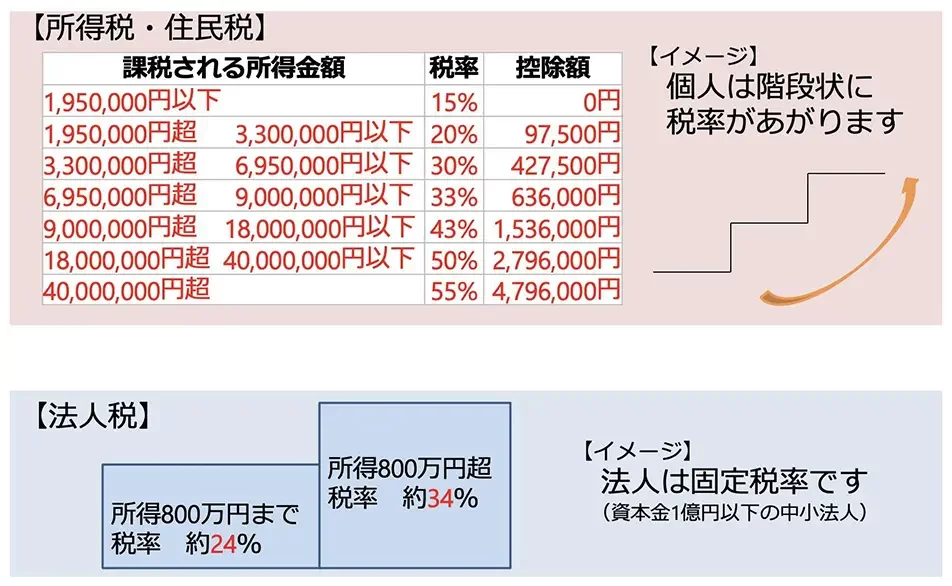 つぎに税率の仕組みを解説します。個人の税率は所得金額に応じて増え、最大55%に達します。一方、法人の税率は基本的に固定で、所得800万円以下は約24%、所得800万円以上は約34%となります。