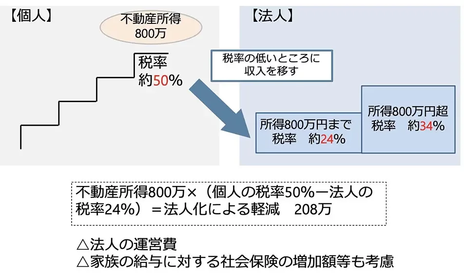 既に給与も2000万円あるため、800万円の不動産所得は、所得税率50%に達します。一方、法人の場合は24%です。そのため、法人化によって年間約208万円の税額の軽減効果が見込めます。(下記の図を参照。)